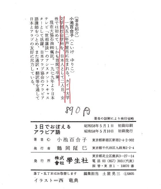 The most obvious one is that she claims to have graduated from Cairo University as the No.1 student. Koike wrote a book titled "Learning Arabic in Three Days" (published 1983). According to this book, "(Koike) is the second Japanese person and the first female Japanese national to have graduate from Cairo University. Koike claims that she graduated as “the No.1 student" from the Department of Sociology, Faculty of Arts".