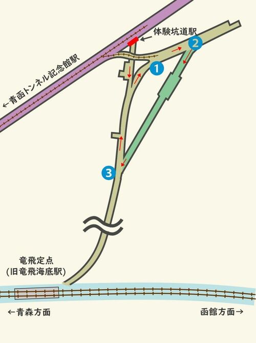 地図の緑色の部分が、青函トンネル工事の歴史を展示する場所だ。地図②から中に入ると、エンタメ性を意識した演出が並んでいて、工事の苦闘ぶりを肌で感じることができる。