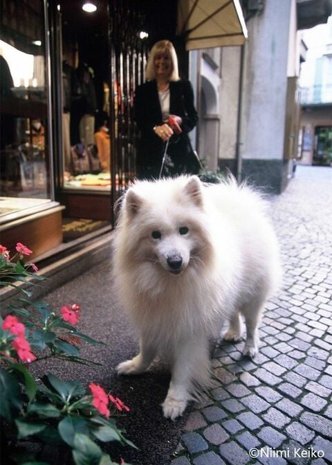紳士服の店。この店のオーナー・マダムと看板犬(サモエド)がシエスタから戻ってきたところです。