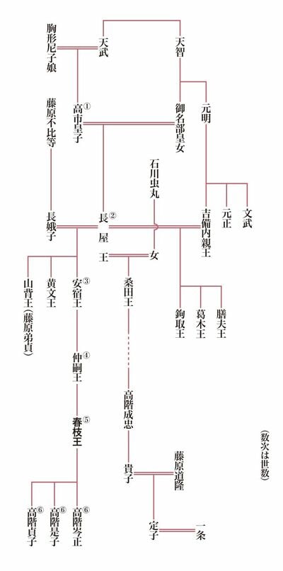 さて、律令の規定では、天皇から四世までは皇親の列に入れられ、数々の特権を得ていたが、慶雲(けいうん)三年(七〇六)に改められて、五世まで皇親ということになった。春枝王の子供たちは、長屋王の祖父である天武天皇から数えて六世になるというので、臣籍降下させられたのである。なお、この時に高階真人を賜わった春枝王の子たち(岑正[みねまさ]・是子[これこ]・貞子[さだこ]) は、その後は史料に見えない。五位以上に叙されることはなかったのであろう。