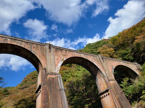 壮大な煉瓦建造物碓氷第三橋梁(めがね橋)は旧線アプトの道で見学可