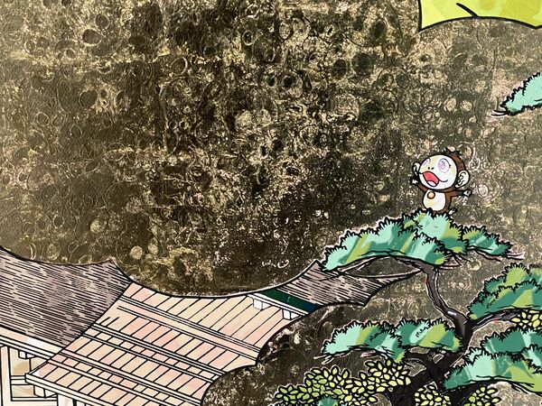 岩佐又兵衛の国宝《洛中洛外図》舟木本を再構築した《洛中洛外図 岩佐又兵衛 rip》(2023−2024)展示風景(写真上)。金の雲にドクロが浮かび、随所に村上のキャラクターが描かれる(写真下)