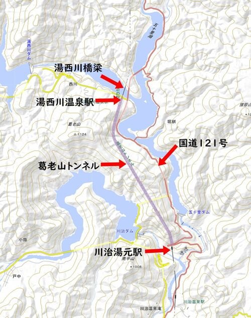 駅名の元である湯西川温泉郷は、実は駅の近くではなく、駅から10km以上離れている。その湯西川温泉郷に行くための栃木県道249号が国道121号から分岐している場所に「湯西川温泉駅」を設けるのがやはり適切だ。