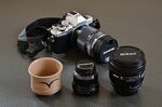写真6:筆者愛用のM.ZUIKO 45mm f1.8レンズ(90mm相当)。右はAF NIKKOR 85mm f1.8、左は唐津へ行ったとき見つけたぐい呑み