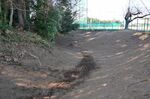 北側の空堀はよく見るとコーナー部分が屈曲している。画面奥は鴻巣高校のグラウンド