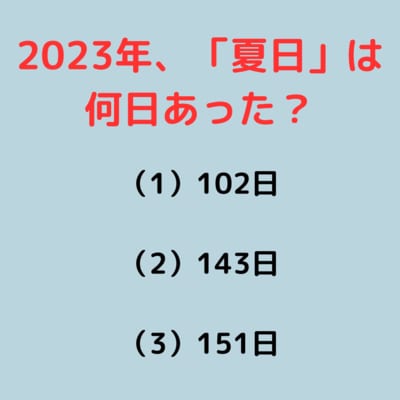 気象庁によると、「夏日」は最高気温が25度以上、「真夏日」は30度以上になった日のことを指す。つまり、正解は(2)。近年よく耳にする「猛暑日」は、35度以上になった日のことだ*1。