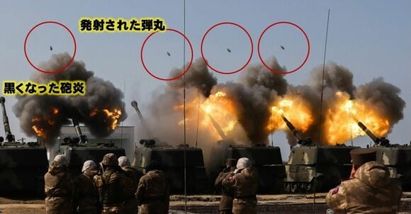 写真5 自走榴弾砲の射撃時の砲炎と発射された砲弾