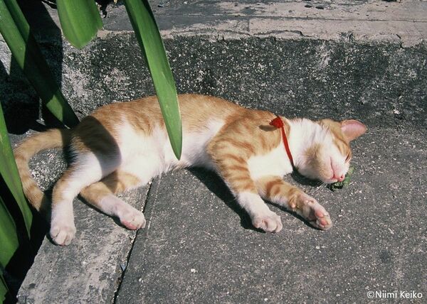 日陰で寝ていた猫が日向にゆっくりと出てきて、ドスンと横になりました。ゴロゴロと喉を鳴らし、前足は小さくグーパー。「暑いけど、やっぱりお日様が好き」と言っているようでした。