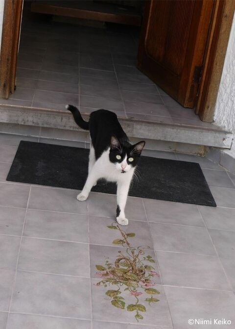 美しいタイルを踏んで出かけると災いから逃れられるというおまじないがあるそうです。猫もこのタイルを踏んで出かけていました。