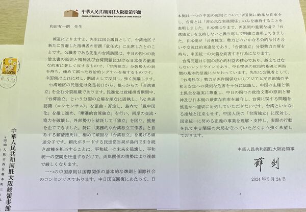 米国や台湾に関連する攻撃的投稿をSNS上で展開するなど“戦狼外交官”として知られる中国の駐大阪総領事・薛剣氏の“書簡”が物議を醸している。5月20日の台湾の総統就任式に出席した日本の国会議員に、「『台湾独立』分裂勢力の肩を持ち…」「越えてはならないレッドライン」などと日台交流をけん制する脅迫状まがいの抗議文を郵送していたことが明らかになったのだ。