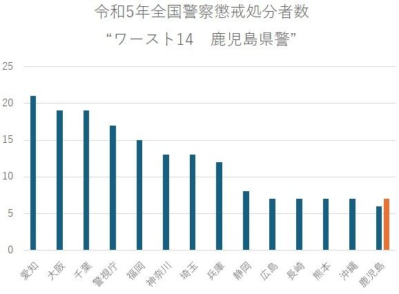 今回注目する鹿児島県警は14位なのですが、あと1人、処分者が増えると・・・。おや、ワースト10に横並びしてしまいますね。
