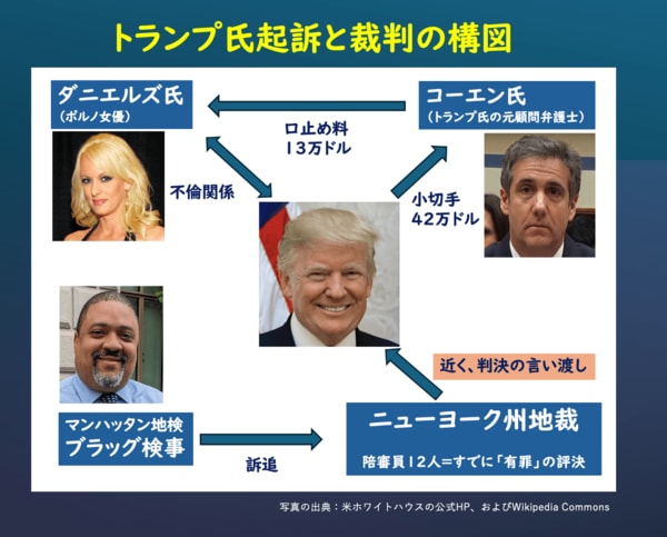 地検はニューヨーク地裁の大陪審にこの事件を訴追し、大陪審は2023年3月、34件に及ぶ第1級事業記録改ざんの罪でトランプ氏を起訴しました。