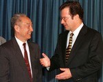1997年、副総理として訪独し、ドイツのキンケル外相(左)と会談する鄒家華氏(写真:ロイター/アフロ)