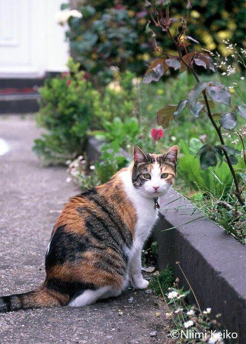 こちらの猫もステキな柄です。白い部分の少ない三毛ですね。町をパトロールしていて、「見かけない顔だわね」というように、こちらを一瞥しました。