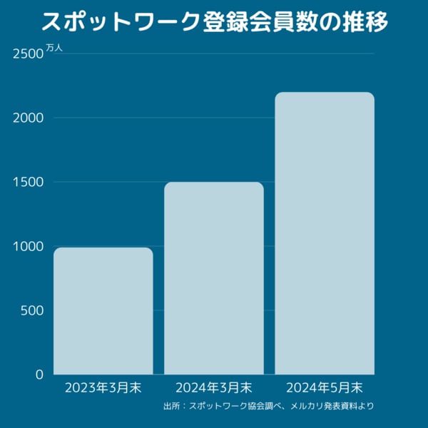 スポットワークの仲介企業で構成するスポットワーク協会によると、24年5月末時点でのスポットワーク登録者数は約2200万人で、23年3月末時点(約990万人)に比べて2.2倍となりました。
