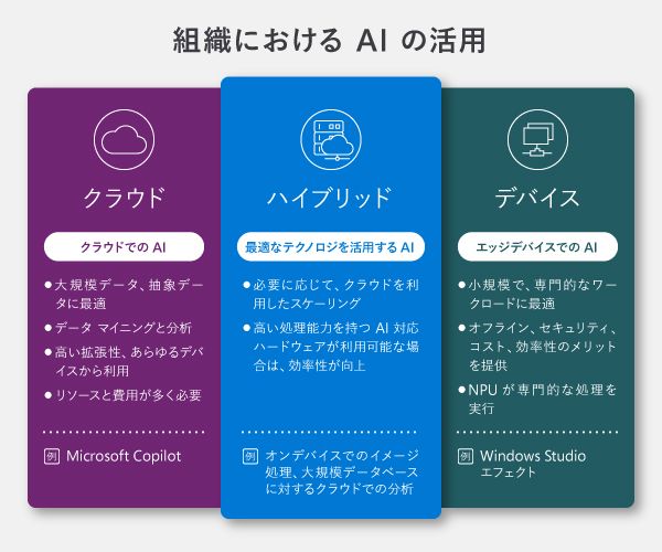 AIは「クラウド」、「ハイブリッド」、「デバイス」で使用されそれぞれ利点も異なる。拡大画像表示
