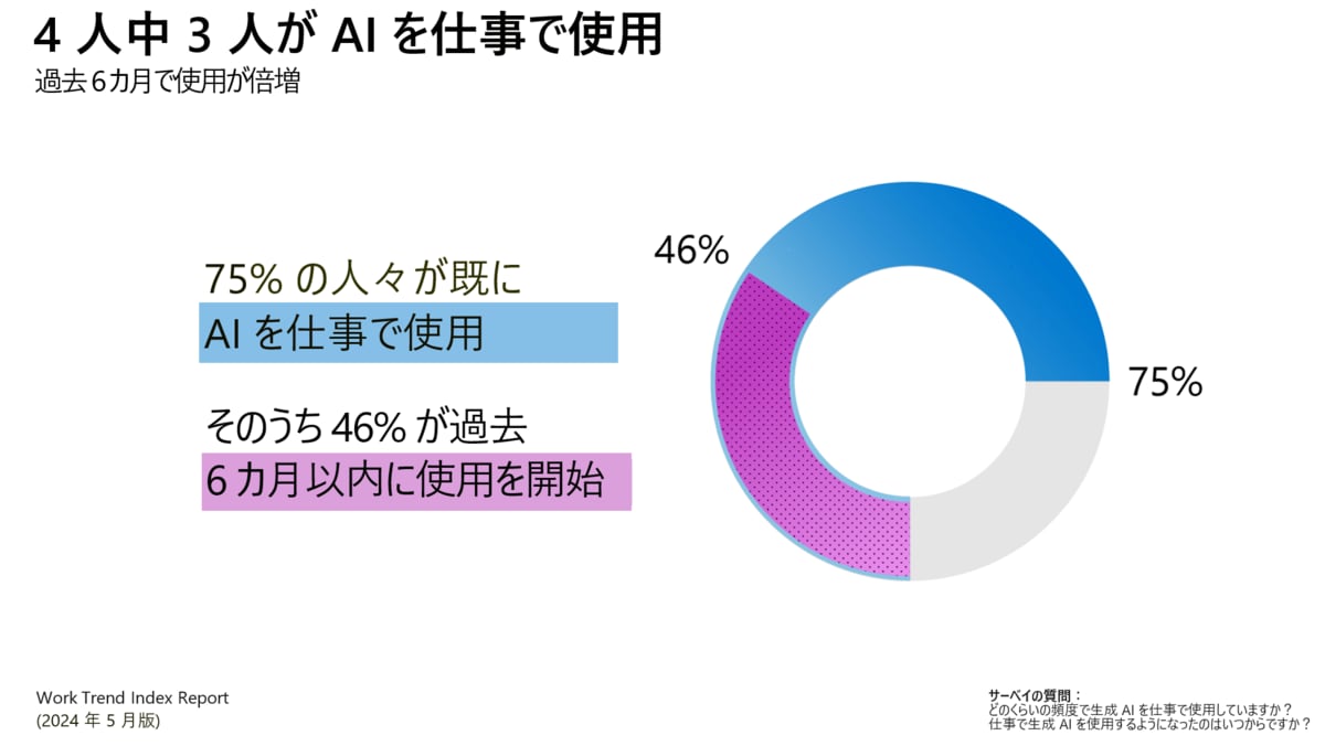 実際に、職場におけるAI活用が急速に進んでいる。同レポートの1年後に公開された「2024 Work Trend Index Annual Report from Microsoft and LinkedIn」によれば、生成AIの利用はこの半年でほぼ倍増し、世界のナレッジワーカーの75%が利用しているという。