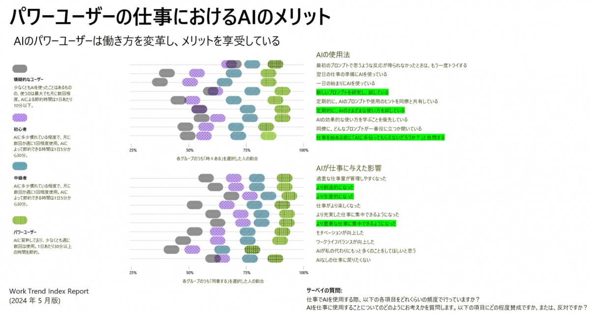 AIを頻繁に利用するパワーユーザーはAI活用により仕事の効率化を行い、仕事への充実感を感じている。2024 Work Trend Index Annual Report from Microsoft and LinkedIn(2024年5月版)