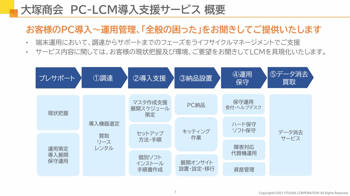 そこで頼りになるのが外部のサービスの活用である。例えばその一つ、大塚商会のPC-LCMサービスは、その名のとおりPCのLCM(ライフ・サイクル・マネジメント)をサポートするサービスだ。PCの調達から導入支援、運用・保守、さらにはデータ消去・買い取りまでを一貫して支援してくれる。