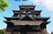 この天守で面白いのは、左右ほぼ対称のデザインになっていることだ。厳密にいうと、窓や狭間のレイアウトが一部非対称なのだが、全体のデザインは左右対称だ。