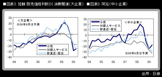 もう1点、筆者作成の短観業種別計数リポートで毎回恒例になっていることだが、消費者と直面している業種のデフレ状況を確認しておきたい。販売価格判断DIと国内での製商品・サービス需給判断DIは、個人消費関連3業種(「小売」「対個人サービス」「飲食店・宿泊」)で、一段の悪化となった。