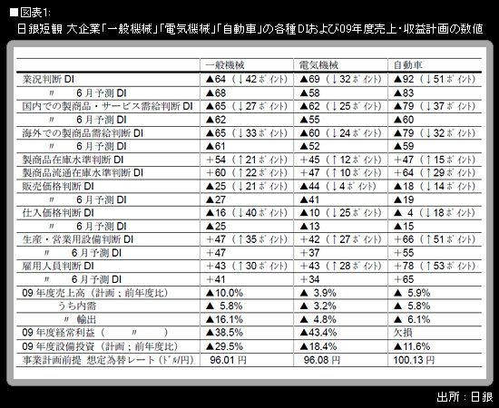 1日に発表された短観の概要ではすでに、大企業の業況判断DIが、輸出関連の主力である「一般機械」「電気機械」「自動車」の3業種で過去最低水準を更新したことが明らかになっている。それら業種の数字を、業種別計数・調査全容から拾ってみた。輸出急減ショックが景気牽引役に及ぼした影響の大きさが浮かび上がる。特に、「自動車」の各種DIは悪化が著しい。内外需要が急減したことで、在庫(含む流通在庫)、さらに生産設備や雇用人員の過剰感が一気に強まった。