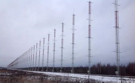 ロシア西部モルドビア共和国コヴィルキノ市に設置されているOTHレーダー(名称「コンテナ」29B6コンテイネル)は、高さ34メートルのアンテナ×144本と管制所から構成されている。