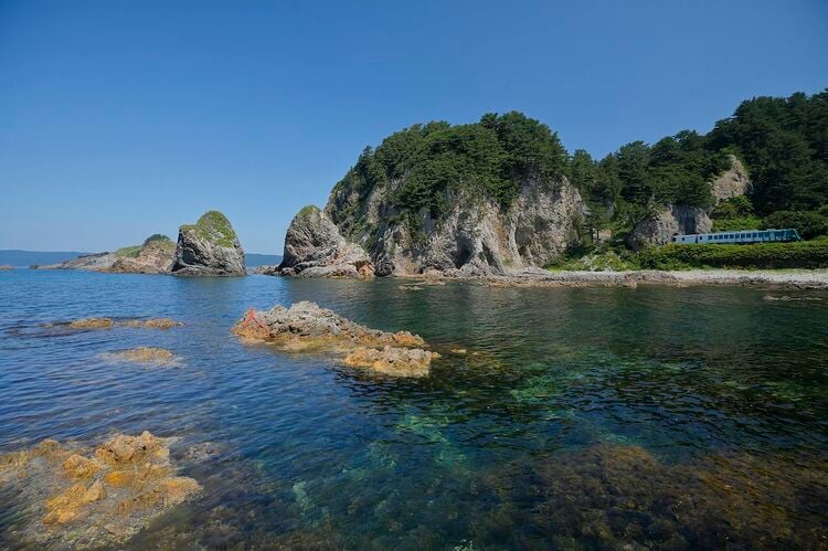 その後、あきた白神駅を過ぎた第二小入川橋梁から車窓いっぱいに日本海が広がっていき、岩館~大間越間の奇岩が織りなす大パノラマや、十二湖の先に広がるガンガラ岩を眺め、荒々しい波がつくりだした岩々が続く深浦海岸で海の景勝はピークを迎える。空に浮かぶ雲の白さとコバルトブルーの澄んだ海、怪石群の茶色とのコントラストは眩いばかり。