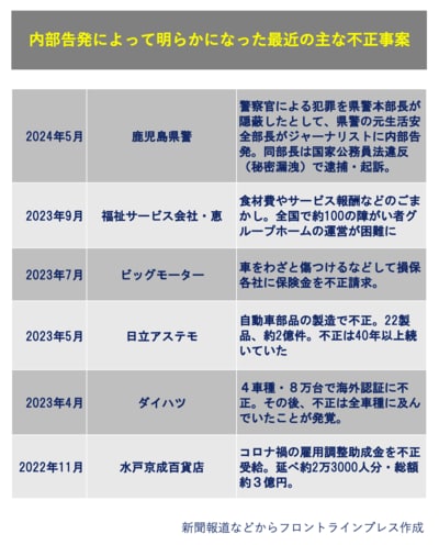 公益通報者保護制度は日本でも少しずつ浸透してきたようです。近年、自動車関連メーカーの検査不正や雇用調整助成金などに関わる不正が相次いで表面化していますが、公益通報がきっかけだったものも少なくありません。通報がなければ今も不正が水面下で続いていたケースもかなりの数に達しただろうと思われます。