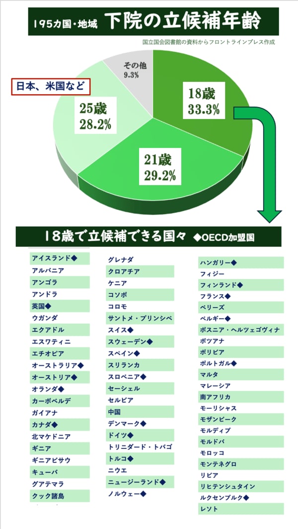先進国36カ国が加盟する経済協力開発機構(OECD)に限ると、立候補年齢を25歳としている国は、日本と米国、イタリア、ギリシャ、リトアニア、韓国の6カ国しかありません。他方、18歳は21カ国、21歳は9カ国を数え、双方を合わせると8割超。日本などの25歳は少数派であることが鮮明になってきます。