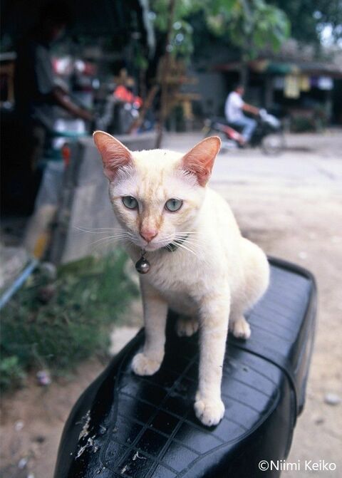 パステルカラーのシャムネコもステキです。この猫は、近所の猫が飼い主のバイクに乗らないように守っていました。シートの上は涼しく感じられるのか、バイクもスクーターも猫たちに人気です。