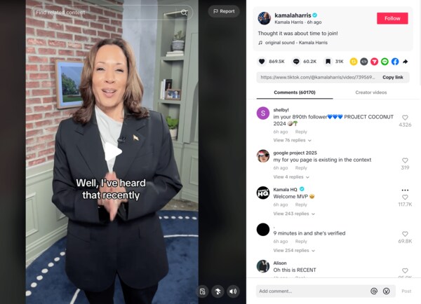 人気ミュージシャンのCharli XCXさんによる「kamala IS brat(カマラこそブラット=イケてる悪ガキ」というXの投稿が拡散し、TikTokではハリス氏が踊ったり大笑いしている動画が広がってZ世代の関心が高まっていると言われます。これを受けて自身もTikTokにアカウントを開設しました。