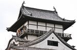 あらためて天守最上部を真っ正面から見る。トップの屋根が横向きだったら、水平線が増えて高さが抑えられて見えただろう