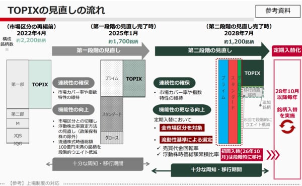 初回の定期見直しは2026年10月に行う。ただし、激変緩和措置のため、初回の定期見直しで除外された銘柄は即全ての組み入れ比率を外すのではなく、2年間かけて、段階的に率を減らし、2028年7月に全量を外す。JPXは第2段階の見直しを同月で完了するとしており、この時点で約1200銘柄に絞り込む。