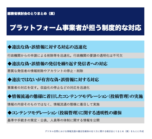 これらの対策についてはこれまで、プラットフォーム事業者の自主的な取り組みに任されてきましたが、総務省案は事業者任せの施策ではだめだと総括。「デジタル空間における情報流通の健全性が脅かされ、ひいては実空間への負の影響を看過し得なくなるという強い危機感」を官民全体で持つべきだ、との認識を示しました。