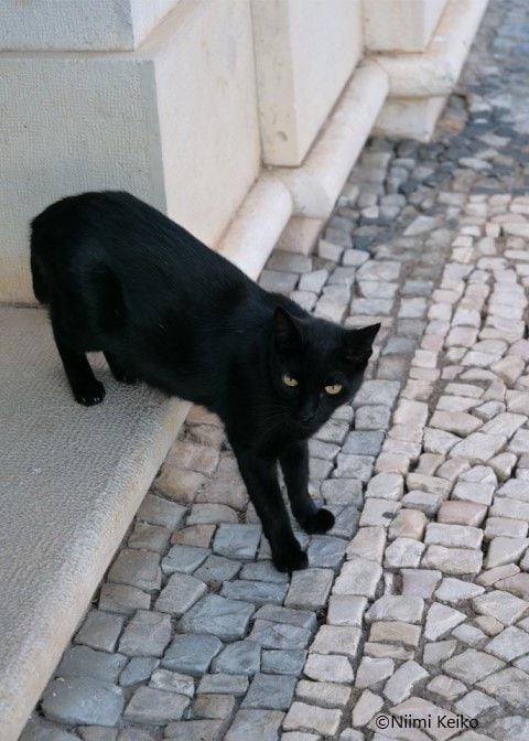 黒猫がいるのは、ポルトガル南部のファーロ旧市街にある市役所の正面玄関です。ファーロは、石畳が美しいことで知られています。天然の色を大切にした石材で、まるで地面に絵が描かれているようです。