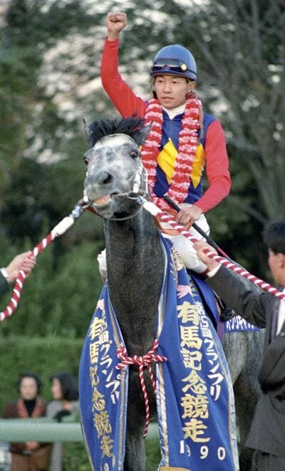 1990年12月、「第35回有馬記念」を優勝で飾ったオグリキャップと武豊騎手 写真=共同通信社
