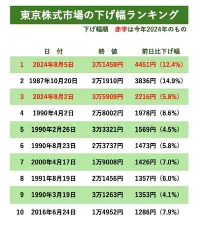 「日経平均4451円安」「下げ幅史上最大」「ブラックマンデー超す」。日本経済新聞がそんな見出しの号外を発行したのは、東京市場で8月5日(月)の取引が終わって間もなくのことでした。日経平均株価(225種)の終値はこの日、4451円28銭安の3万1458円42銭という記録的な暴落に見舞われたのです。