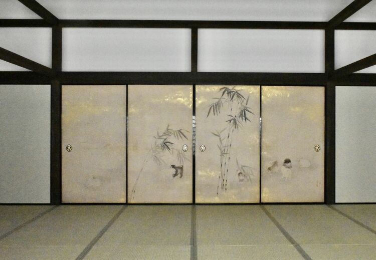 「空間と作品」展示風景。円山応挙《竹に狗子波に鴨図襖》 江戸時代 18世紀