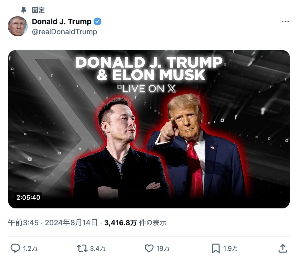 トランプ氏とマスク氏は8月12日(現地時間)、Xで対談した(画像:トランプ氏のXアカウントより)
