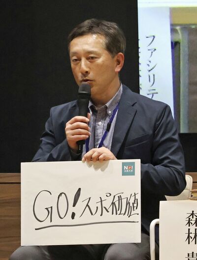 スポーツ関連のイベントで、主体性重視の指導を訴える慶応高校の森林監督(写真:共同通信社)