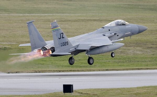 沖縄県の米空軍嘉手納基地から離陸する米空軍のF15C戦闘機(写真:共同通信社)