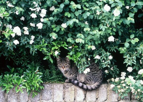 この猫は公園の木陰で涼んでいました。カメラを向けると、少し緊張したのか、だらんと垂らしていたシッポを体に寄せました。シッポのアーチがきれいです。