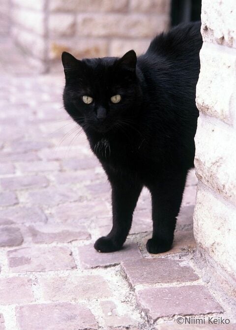 壁の陰から片目だけ出してこちらの様子をうかがっていたので、「黒ちゃーん」と小さく呼んでみると、「なになに?」と、少しずつ前に出てきました。漆黒でツヤツヤな黒ちゃんでした。