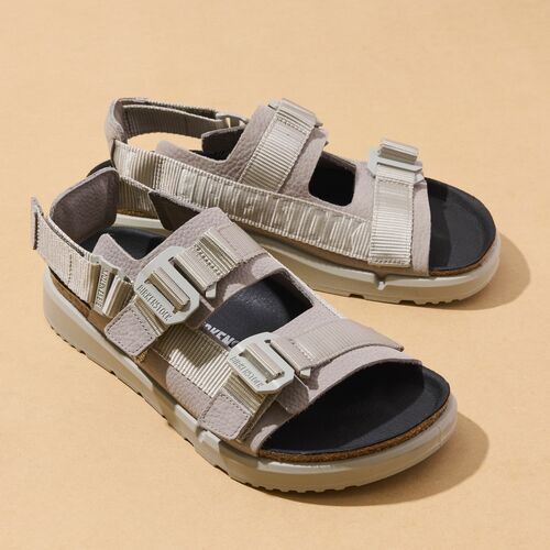 アッパーのベースには、これまでも多くのモデルに用いられてきた柔らかくフィットする上質なヌバックレザーを採用。ユーティリティウェアを着想源としたメタル製Gフックバックルと、ウェビングベルトのサイドに施され“BIRKENSTOCK”のデボスロゴが、ストリートな雰囲気を援護射撃。バックストラップの大ぶりなヒールパッドも快適性を保証する。