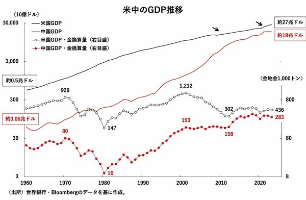 そこで、もし仮に「ニクソンショック以前の制度(ブレトンウッズ体制)が継続していたら」という前提で、米中間の経済規模を比較してみると、意外な事実が浮かび上がってくる。