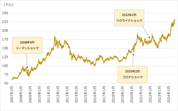 まずは金価格の推移を、金価格の値動きに連動するETF(上場投資信託)の「SPDRゴールド・シェア」(GLD)で確認していきます。