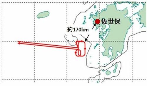 中国軍情報収集機「Y-9」が、2024年8月26日、下図のように接近飛行を行い、午前11時29分頃から11時31分頃にかけて、長崎県男女群島沖の領海上空を侵犯した。