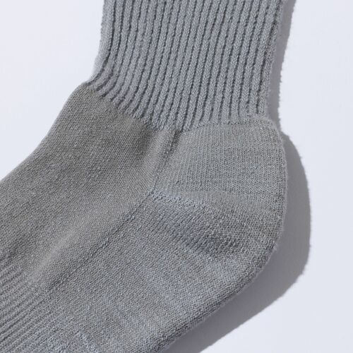 米軍が採用するソックスと同様となる独自のミルスペックを設定し、肉厚ながら湿気が溜まりにくく、クッション性を備えたフットベッドの導入など、タフで機能的なソックスを生み出している。写真の一足は定番かつ多くの装いにマッチするライトグレーモデル。シンプルなカラーゆえにスニーカーはもちろん革靴にまで合わせることが可能だ。