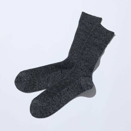 写真の一足はフィット感や耐久性を追求したリブ編みのカジュアルモデル。太糸を用いゆったり編むことに始まり、かかとのサポート部分を長めに設定するなど、優れたホールド性とズレを生まない仕立てを実現。さらに写真のモデルでは、ヌメリ感を持つスーピマコットンにシルク風加工を施した糸を使用し、上質感と包み込むような柔軟さを打ち出している。専門ブランドらしいこだわりを随所に込めた名品と言える一足だ。